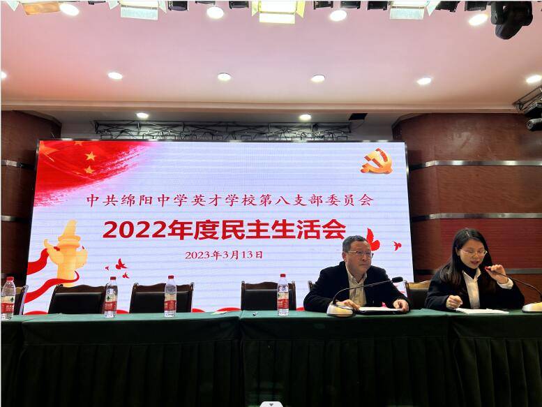2023年3月13日晚,绵阳中学英才学校第八党支部在小学部食礼堂召开了2022年度民主生活会,支部全体党员同志出席会议。绵阳中学英才学校党委副书记、执行校长赵前程同志莅临会议并做工作指示。会议第一项议程,第八支部
